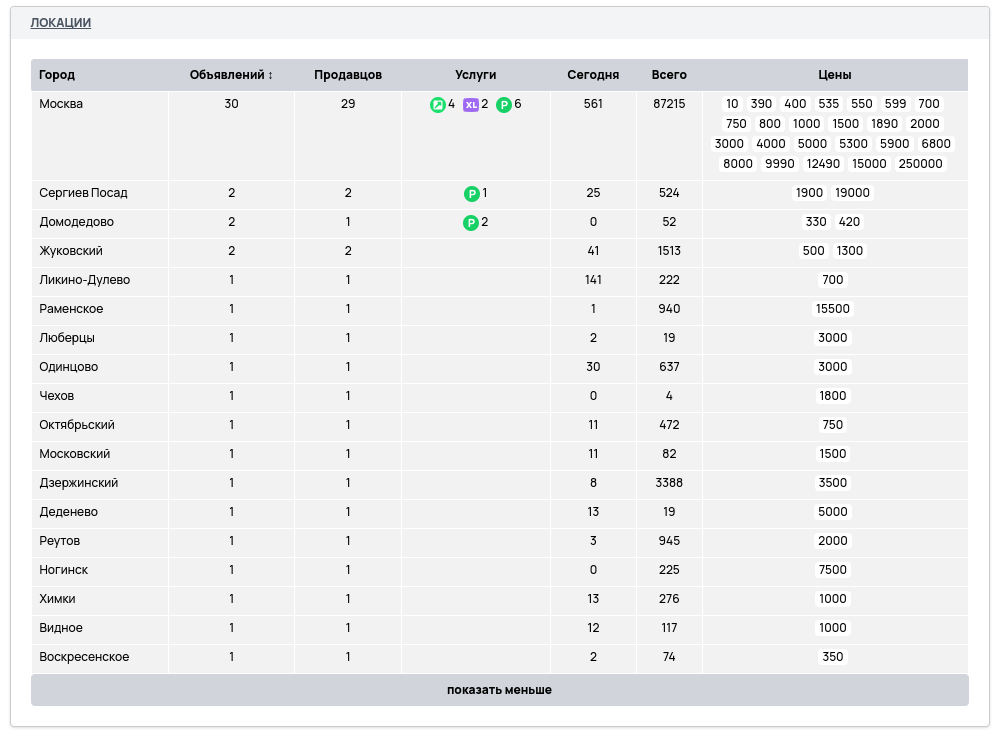 Если у вас были подгружены данные по объявлениям, то они так же отобразятся в этой таблице, и можно посмотреть в каких локациях больше всего просмотров.