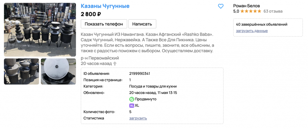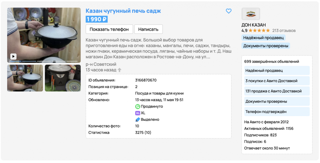 Здесь же можно загрузить дополнительную информацию о продавце. Вот так выглядит объявление со всеми подгруженными данныеми: