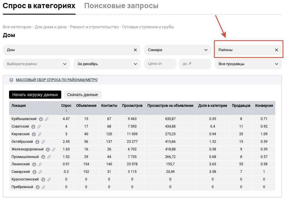 Мы расширили возможность спроса в категориях, и теперь можно подгружать данные по каждому метро/району. Необходимо чтобы была выбрана настройка локации для появления таблицы.