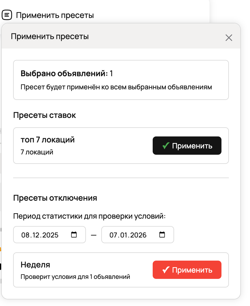 Возможность создавать пресеты настроек продвижения и их применение к списку объявлений, чтобы не настраивать отдельно для каждого объявления продвижение: